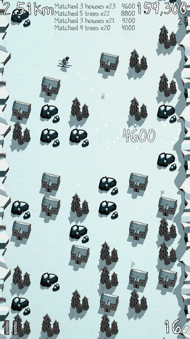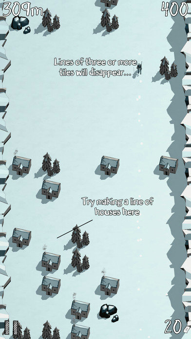 本作是一款三消游戏,玩家需要在游戏中将矗立在雪地上的房屋、树林、石头等物品连成3个,将雪地上的道路清理出来,引导滑雪者前进。游戏中将会有多道不同的关卡,玩家需要快速的消除雪地上的物品,不要让滑雪者撞上从而结束游戏。