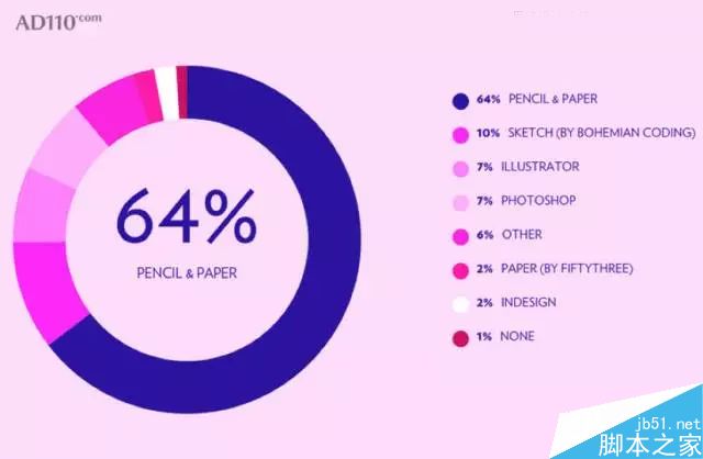 2015年,Adobe 联合纽约几家知名的设计事务所只做了一份名为“设计师最喜欢的工具调查”,问卷被发放到200多个国家,回收到近4000份有效问卷,调查结果显示,约64%的设计师最喜欢的工具是纸和笔。